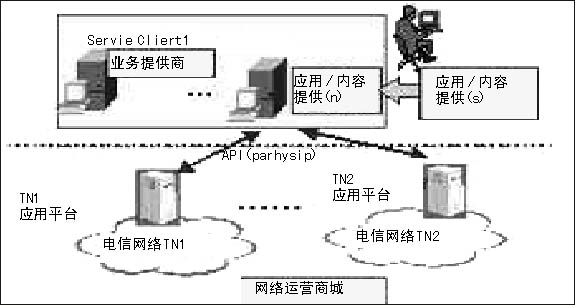 這種模式是指應(yīng)用服務(wù)器的兩部分應(yīng)用平臺(tái)和業(yè)務(wù)提供分別由傳統(tǒng)電信運(yùn)營商和AP控制。應(yīng)用平臺(tái)在運(yùn)營商域內(nèi)由運(yùn)營商進(jìn)行控制,而AP或者CP(Content provider)可以與傳統(tǒng)電信運(yùn)營商簽約來提供業(yè)務(wù),業(yè)務(wù)與應(yīng)用提供通過開放的API由第三方提供。